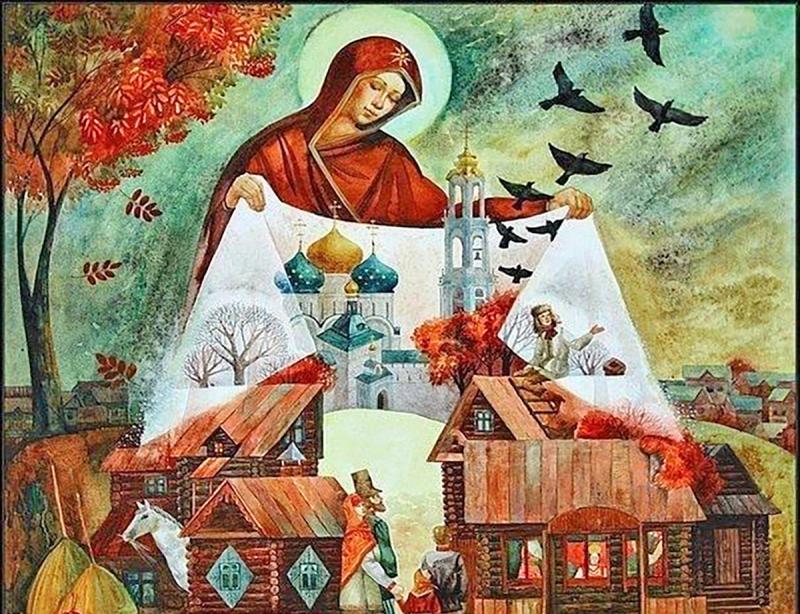 Славяне по-своему переосмыслили византийское предание, создав собственные сказания о Покрове Богородицы. Например, появилась легенда о том, как Пресвятая Дева странствовала по земле и в какой-то деревне ей отказали в ночлеге. Разгневанный жестокосердием местных жителей, пророк Илья принялся метать в деревню молнии, заливать посевы дождём и побивать градом. Однако милостивая Богородица пожалела людей и спасла их, развернув над деревней своё покрывало. После этого тамошние жители будто бы стали удивительно гостеприимными, а Богородицу «стали писать на иконах покрывающею люд божий своею одеждою».