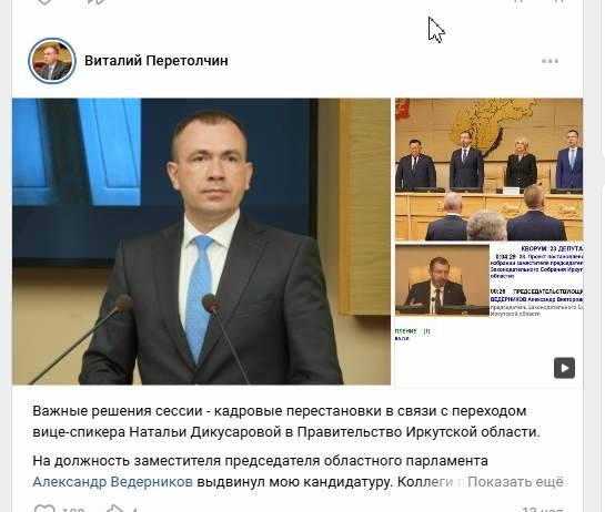 Также взлетевший по карьерной лестнице свежеиспеченный вице-спикер парламента Виталий Перетолчин опубликовал по этому поводу такое фото, что впору и для спикерства приберечь. Ну кто Виталий был такой, когда начал работать в Усть-Илимске на местного серого кардинала Салавата Керимова?