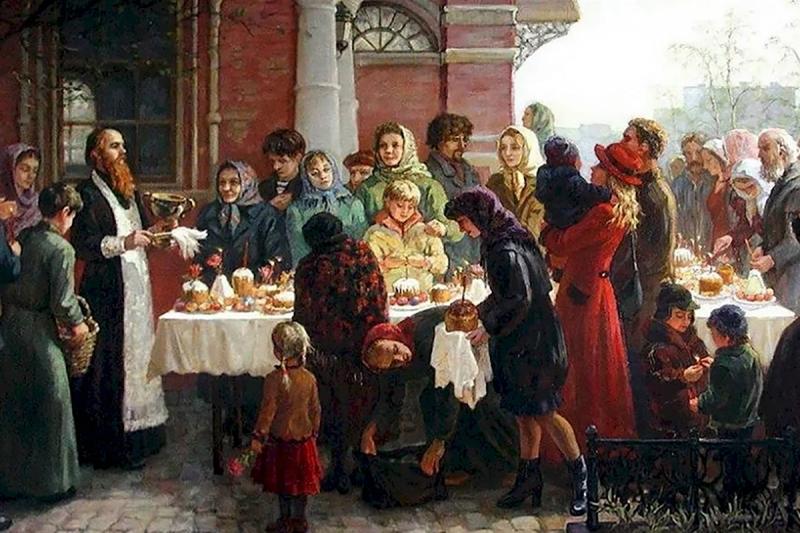 По завершении службы все начинали приветствовать друг друга: «Христос воскресе!» — «Воистину воскресе!» Люди «христосовались» — обменивались крашеными яйцами, обнимались и целовались. После окончания литургии «пасочники» с куличами, пасками и яйцами в руках выстраивались в церковной ограде, а священник с молитвой окроплял еду святой водой. Некоторые прихожане прямо из церкви отправлялись на кладбище, чтобы «похристосоваться» там с покойными родственниками, поздравить их с праздником, и лишь потом шли домой — «разговляться на Пасху».