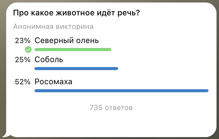 Телеграм-канал «Бурятия. Бабр. Дальше некуда» спросил читателей, про какое животное идёт речь. Только 23 % опрошенных догадались, что это Северный олень.