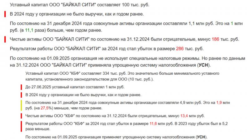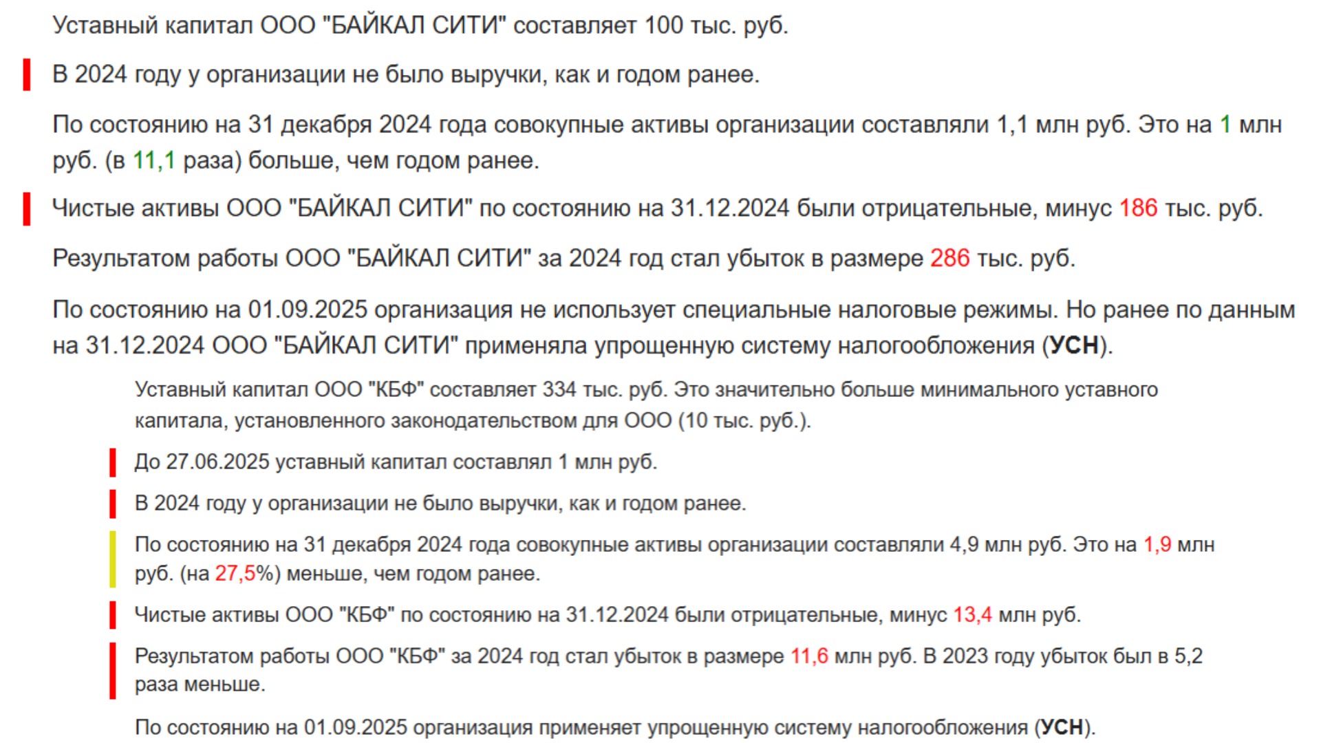 Московское ООО «КБФ» (ОГРН 1237700128027), которое стало новым владельцем «Байкал Сити», также не блещет успешной финансовой историей. Компания зарегистрирована в 2023 году. Её основной вид деятельности — консультирование по вопросам коммерческой деятельности. В 2023 и 2024 годах «КБФ» не имел выручки. Убыток за 2024 год достиг 11,6 миллиона рублей, что в 5,2 раза больше убытка предыдущего года. Чистые активы компании отрицательные: минус 13,4 миллиона рублей.