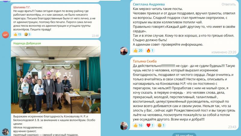 Люди обиделись, в местных чатах пошло бурление. И Коновалов, судя по всему, решил использовать бюджетников как ботов, чтобы подавить недовольство. В комментариях к посту внезапно и хором стали появляться комментарии в защиту «вкусного пирога» и «щедрого главы». Первой в атаку пошла Тамара Шалаева, заведующая Итанцинским детским садом «Берёзка». Она агрессивно потребовала «не врать», утверждая, что пироги вообще-то домашние.