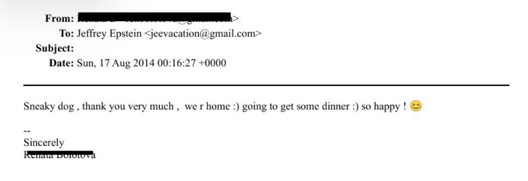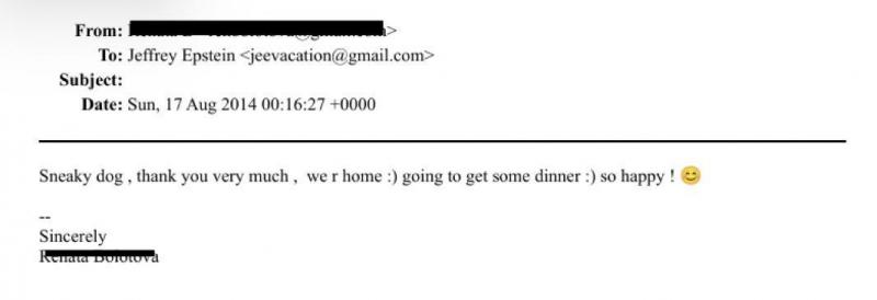В письме от 2019 года Эпштейн пишет ассистентке: «Пожалуйста, организуй билеты, отель и расходы для визита родителей Ренаты». В данных также обнаружен черновик эссе, отправленный с личной почты Эпштейна. Автор текста в нём описывает свою биографию: переезд из «маленького городка Улан-Удэ» в Санкт-Петербург в 2007 году, столкновение с расизмом из-за азиатской внешности, участие в ЛГБТ-активизме (международное общественное движение ЛГБТ признано экстремистским и запрещено в РФ) и последующий переезд в США.