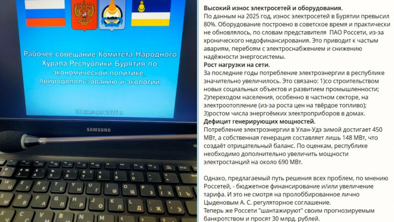 Кроме того, депутат Хурала Эржена Чимитцыренова на рабочем совещании комитета 30 января сообщила, что компания «Россети» требует из бюджета 30 миллиардов рублей, угрожая банкротством. При этом износ сетей в Бурятии превышает 80%. Подстанция «Нижний Саянтуй» перегружена на 240%.
