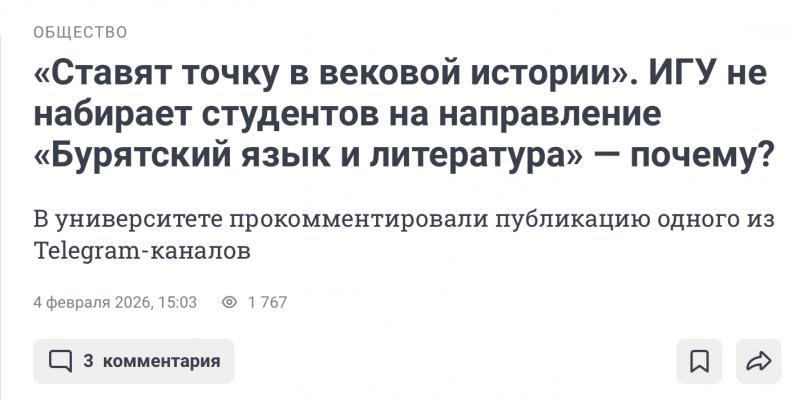 #Нампишут: Только абсолютно равнодушные к сохранению бурятского языка, к ситуации с ним в Иркутской области и Усть-Ордынском округе, могут не знать реального положения дел. Начиная с 90-х годов набор на эту специальность падает, число бюджетных мест, соответственно, снижается. В последние несколько лет только энтузиазмом преподавателей кафедры бурятской филологии выполнялись наборы нескольких человек ( 20-5-3..): они сами ездили по бурятским территориям, находили выпускников школ, хоть немного владеющих бурятским языком, буквально уговаривали их поступать на бурятское отделение ИГУ! Чаще всего бюджетные места занимали те, кто не прошёл на другие специальности, поступив, они уходили, не продолжали учёбу. Руководство ИГУ и преподаватели, в настоящее время, все пенсионеры, шли на все возможные варианты, чтобы сделать эту специальность привлекательнее для абитуриентов, но и это не обеспечивает должного набора. Зачем выделять бюджетные места, если на них нет желающих? Простая логика, подтверждëнная многолетней реальностью.
