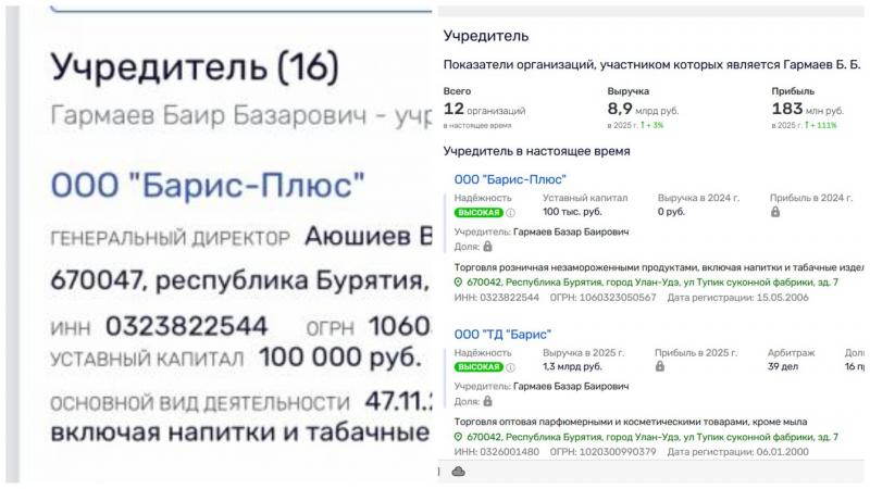 Семья предусмотрительно переоформила торговую империю «Барис» на родственников и доверенных лиц. Документально вице-спикер к ней отношения не имеет. В креслах учредителей сидят его сын Базар Гармаев и постоянный бизнес-партнёр Вячеслав Аюшиев. Оптовые поставки идут через зарегистрированное в Улан-Удэ ООО «Торговый дом Барис» (ОГРН 1020300990379). За 2025 год эта организация принесла выручку в размере 1,3 миллиарда рублей. Чистая прибыль оптовика достигла 74,5 миллиона рублей. В штате стабильно числятся 79 сотрудников.