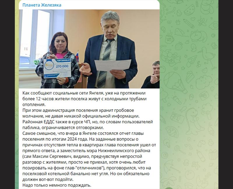 Два остова противостояния – поселки Янгель и Новая Игирма – до последнего бойкотировали инициативу мэра. Понять их можно: оба населенных пункта удалены от районного центра. И если Игирма – городское поселение, вполне сопоставимое по численности с самим Железногорском, то Янгель – это вовсе брошенный на побережье Илимского водохранилища поселок с несколькими сотнями жителей.