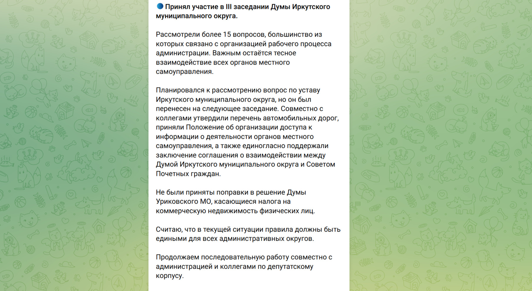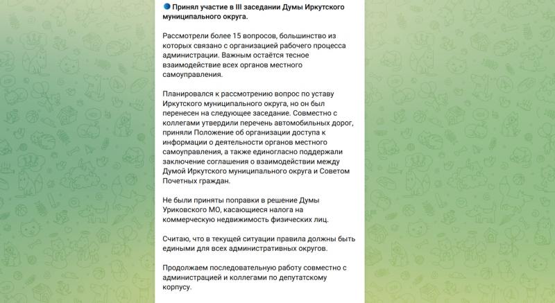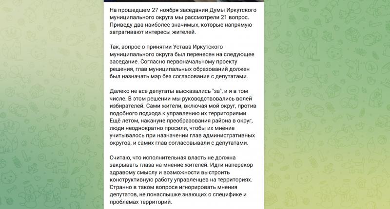 «Мэром округа было направлено обращение в Думу с предложением снять вопрос принятия Устава с повестки заседания. Причина заключается в необходимости дополнительного проведения консультаций с депутатскими фракциями. Устав является ключевым документом муниципалитета, и его принятие должно проходить ответственно и открыто. Прошлые публичные слушания, проведённые неделю назад, оказались формальностью: присутствовало менее десяти человек, преимущественно депутаты и сотрудники администрации. Предложенные мною рекомендации относительно порядка согласования статей и процедуры тайного голосования остались без внимания. По моему мнению, Устав нуждается в дальнейшей доработке перед окончательным утверждением».