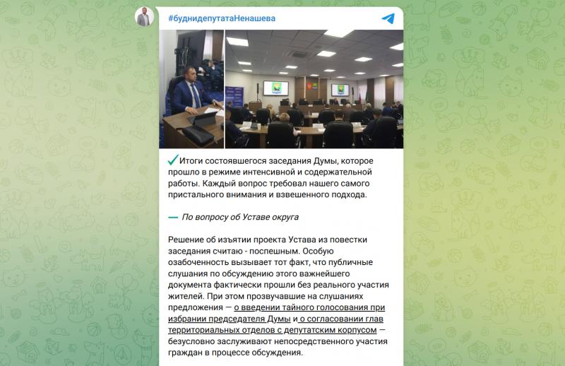 Депутат Алексей Ненашев подробно у себя на странице отразил суть происходящего и свою позицию по проекту Устава: