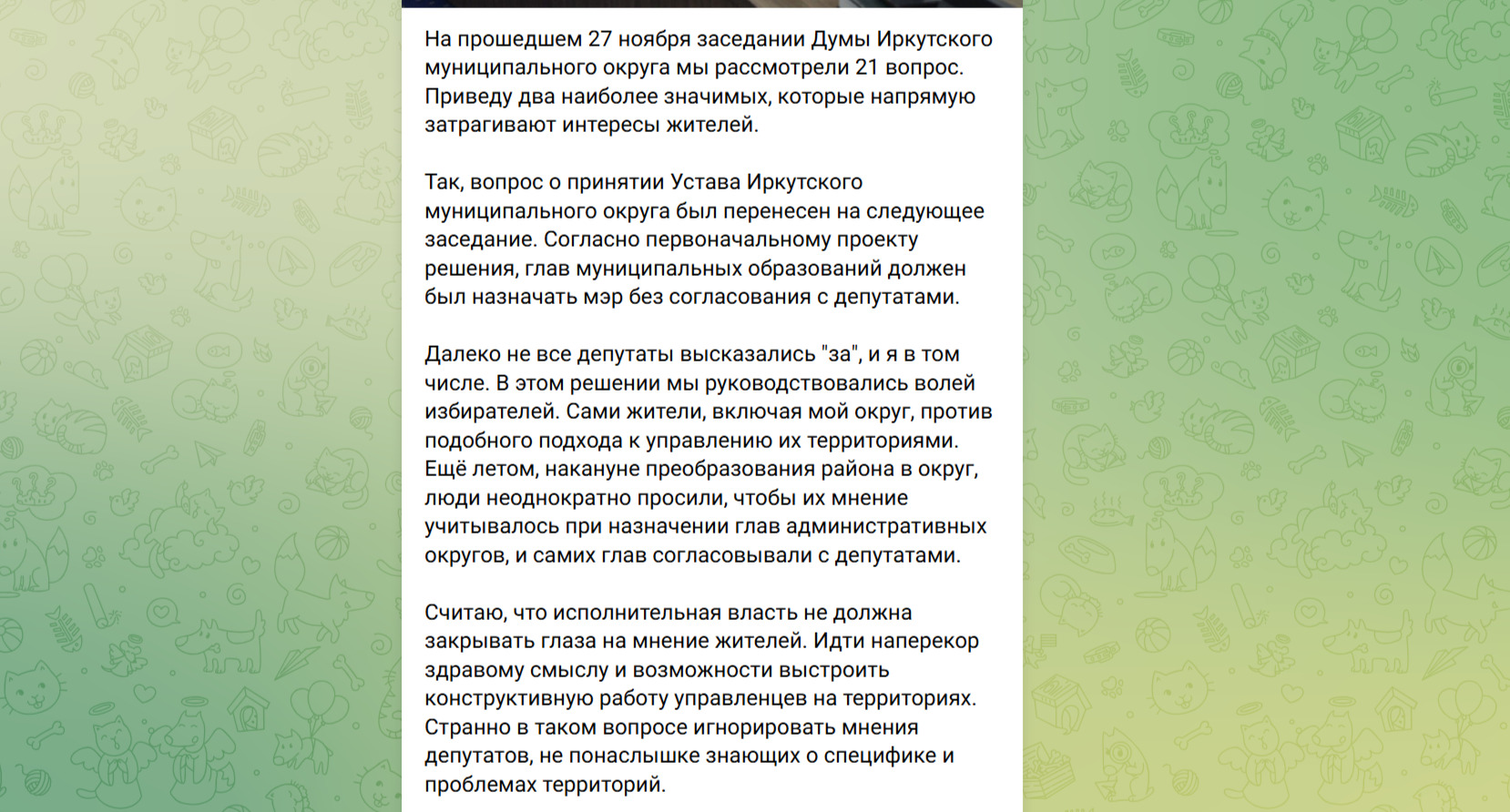 «Решение об изъятии проекта Устава из повестки заседания считаю поспешным. Особую озабоченность вызывает тот факт, что публичные слушания по обсуждению этого важнейшего документа фактически прошли без реального участия жителей. При этом прозвучавшие на слушаниях предложения — о введении тайного голосования при избрании председателя Думы и о согласовании глав территориальных отделов с депутатским корпусом — безусловно заслуживают непосредственного участия граждан в процессе обсуждения.