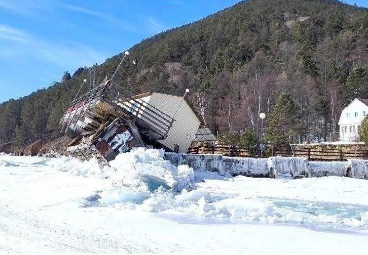22 марта лёд вывернул основную опору причала из грунта вместе с домиком. Когда лёд растает, сооружение может уйти под воду.