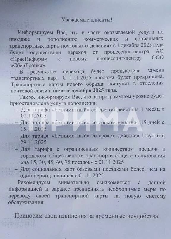 С 1 ноября жители Красноярска не смогут приобрести привычные транспортные карты. Уведомления об этом появились в отделениях почты. Фото одного из объявлений опубликовал телеканал «Прима».