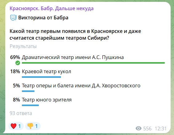 Настало время подвести итоги опроса и викторины, которые касались театральной тематики. Бабр решил поинтересоваться у подписчиков, какие театры они предпочитают посещать и какой театр первым появился в Красноярске и считается старейшим в Сибири? Удивительным образом правильный ответ викторины совпал с выбором театра нашими подписчиками.