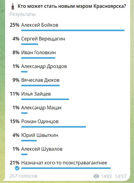 На фоне этой замечательной новости Бабр решил узнать у своих подписчиков, кого могут назначить мэром Красноярска и провёл опрос в своём телеграм-канале «Красноярск. Бабр. Дальше некуда» (@kras_24).
