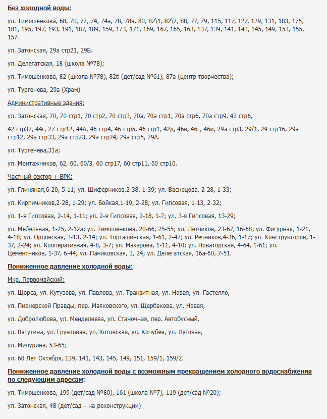 Жители микрорайона Первомайский, а также поселков Водники и Торгашино вынуждены будут провести сутки без холодного водоснабжения. Ограничения вступят в силу 3 декабря в 23:00 и продлятся ровно 24 часа — до 23:00 4 декабря.