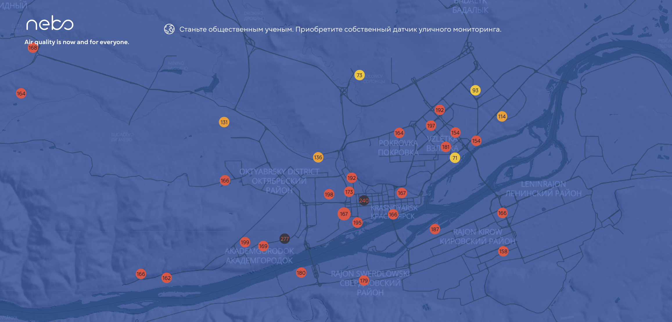 Датчики Nebo.Live фиксируют загрязнение воздуха во всех районах Красноярска.