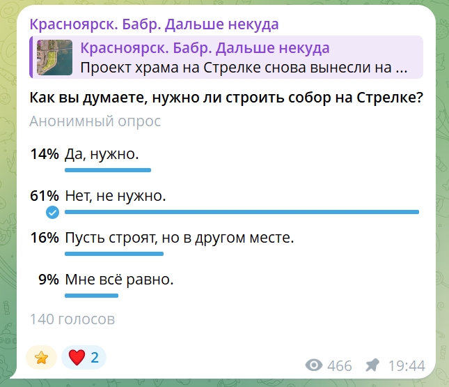 Кстати, что касается темы нужности собора горожанам. В октябре 2024 года в опросе Бабра 81% был против строительства. Вчера, 29 января, Бабр запустил новый опрос по теме. На данный момент вновь лидирует вариант «Нет, не нужно».
