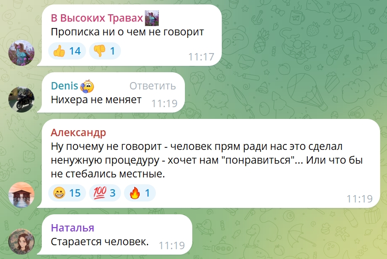 «Мне кажется, у нас не запрещено иметь прописку не там, где ты живёшь фактически. Тем более это никак не мешает человеку выполнять свои обязанности, и выполнять их на достаточно хорошем уровне. У меня действительно московская прописка. Я никогда, на самом деле, этим, прошу прощения, не заморачивался».
