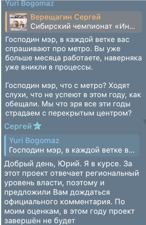 Красноярцы продолжают активно интересоваться судьбой метрополитена и требуют ответов от властей. 13 февраля красноярец по имени Юрий спросил нового главу города Сергея Верещагина о наболевшем: сдадут ли первую ветку в этом году и не зря ли горожане терпят перекрытый центр. Вопрос он задал в комментариях в телеграм-канале чиновника.