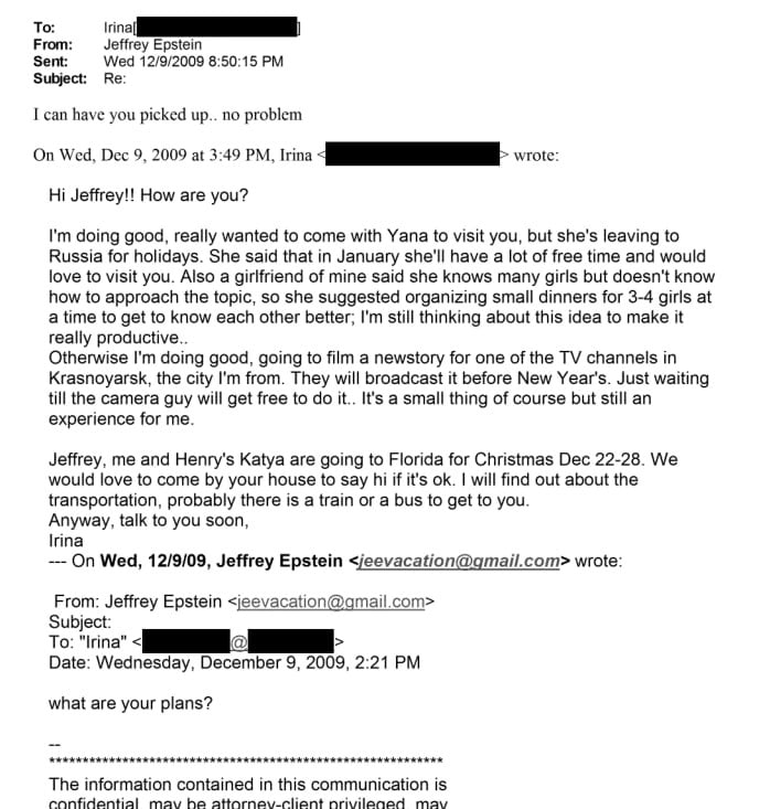 В частности, Ирина интересуется делами Эпштейна, рассказывает, что хочет приехать к нему в гости со своими друзьями. В письмах упоминается организация ужинов с русскими девушками. Также Ирина рассказывала, что планирует снимать новогодний сюжет для какого-то местного красноярского телеканала.