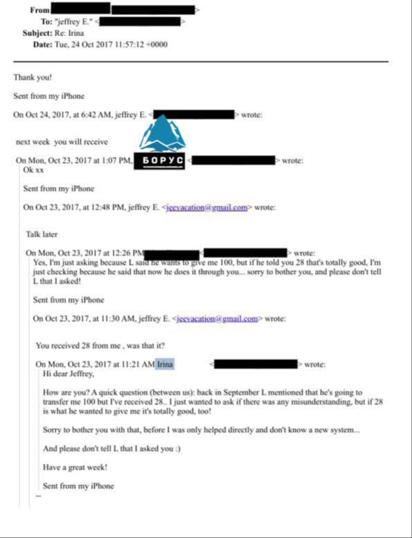 Вновь почта Ирины появляется в файлах Эпштейна в 2017 году. В одном из последних писем девушка сообщает, что ей обещали заплатить 100, а заплатили только 28. На что Эпштейн отвечает, что остальное отдадут на следующей неделе.