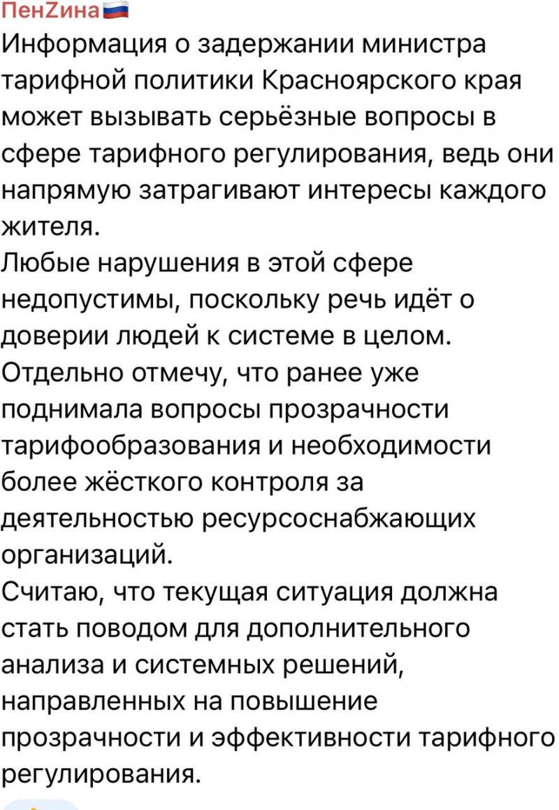 Заместитель председателя комитета ЗС края по строительству, жилищно-коммунальному хозяйству и вопросам ГО и ЧС Елена Пензина прокомментировала задержание министра тарифной политики Красноярского края Александр Ананьева: