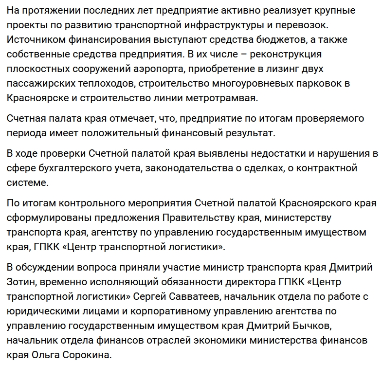 Примечательно, что после смены буровой машины Счетная палата края встроилась в систему антикриза внутриполитического блока. И интересно было наблюдать, как после ареста главного строителя метротрама от края, главы центра транспортной логистики Августиновича 5 декабря прошлого года, уже 6 декабря (выходной день) Счетная палата края выпустила пост о проверке ЦТЛ.