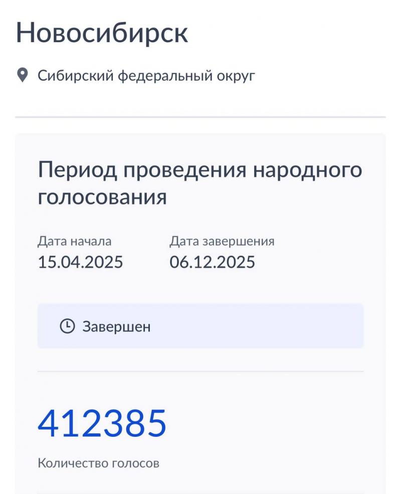 Но несмотря на неожиданный и маловероятно, что в полной мере законный перенос сроков, победу одержал Новосибирск. 6 декабря 2025 года стало официально известно, что в народном голосовании конкурса «Культурная столица России — 2027» победила столица Сибири. На Госуслугах за Новосибирск проголосовало более 400 тысяч человек. Здесь важно отметить, что итоги народного голосования будут учитываться при определении абсолютного победителя конкурса наравне с экспертной оценкой и результатами публичных презентаций. Победитель из восьми городов-финалистов будет объявлен уже 14 декабря этого года. Сейчас начинается второй этап, где Новосибирску предстоит достойно защитить свою заявку.