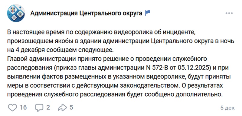 Реакция руководства на этот цирк оказалась предсказуемо вялой. Глава округа Владимир Захаров заявил, что ему «очень неприятно», но увольнять или отстранять Маскалёва он не спешит. Вместо этого назначили служебную проверку. Захаров считает, что коррупции здесь нет, а значит, и повода для резких движений тоже. Такая позиция выглядит как попытка просто дождаться, пока шум в соцсетях утихнет. Но утихнет ли он, когда чиновники превращают муниципальное здание в кабак?
