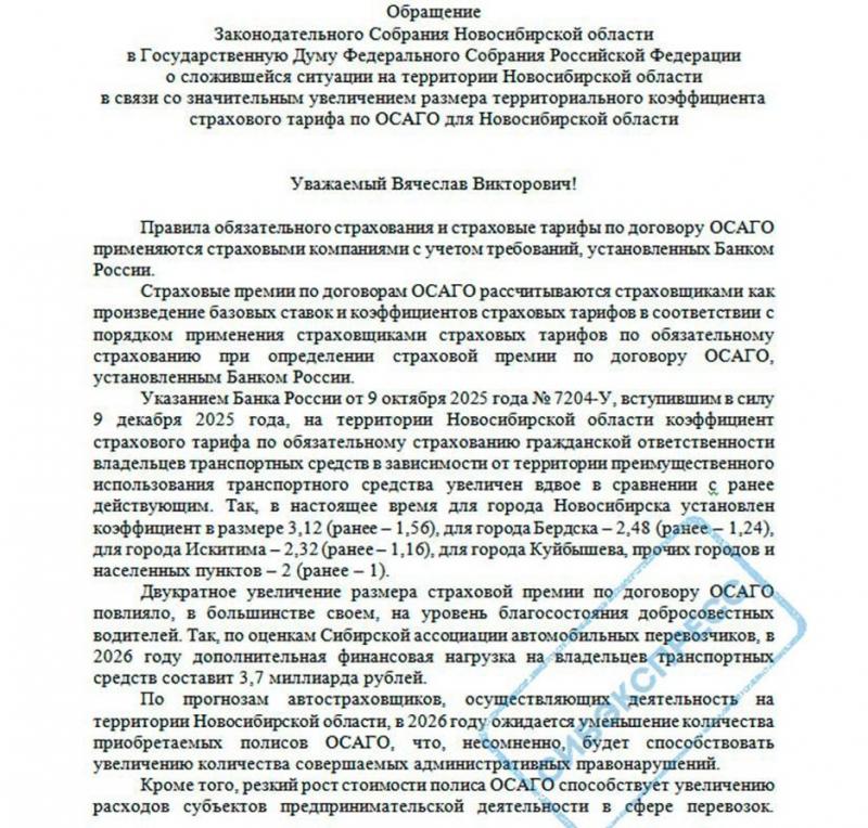 Резкий рост стоимости ОСАГО в Новосибирской области наконец-то перестал быть темой кухонных разговоров. Попытки федеральных властей бороться со страховым мошенничеством за счёт обычных водителей встретили сопротивление. Местные парламентарии направляют жалобы в Москву, пытаясь остановить изъятие миллиардов рублей из экономики области.