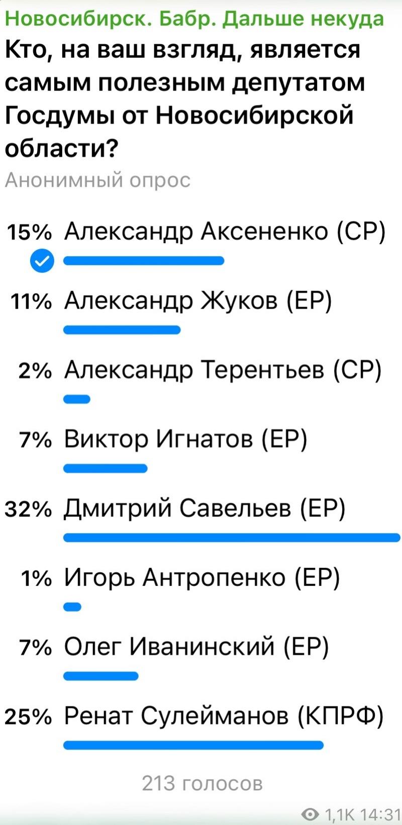 Итак, 24 марта 2026 года в тг-канале «Новосибирск. Бабр. Дальше некуда» (@novosib_24) был запущен опрос «Кто, на ваш взгляд, является самым полезным депутатом Госдумы от Новосибирской области?». В нём приняли участие 213 человек. Всего публикацию просмотрели 1,1 тысячи человек.
