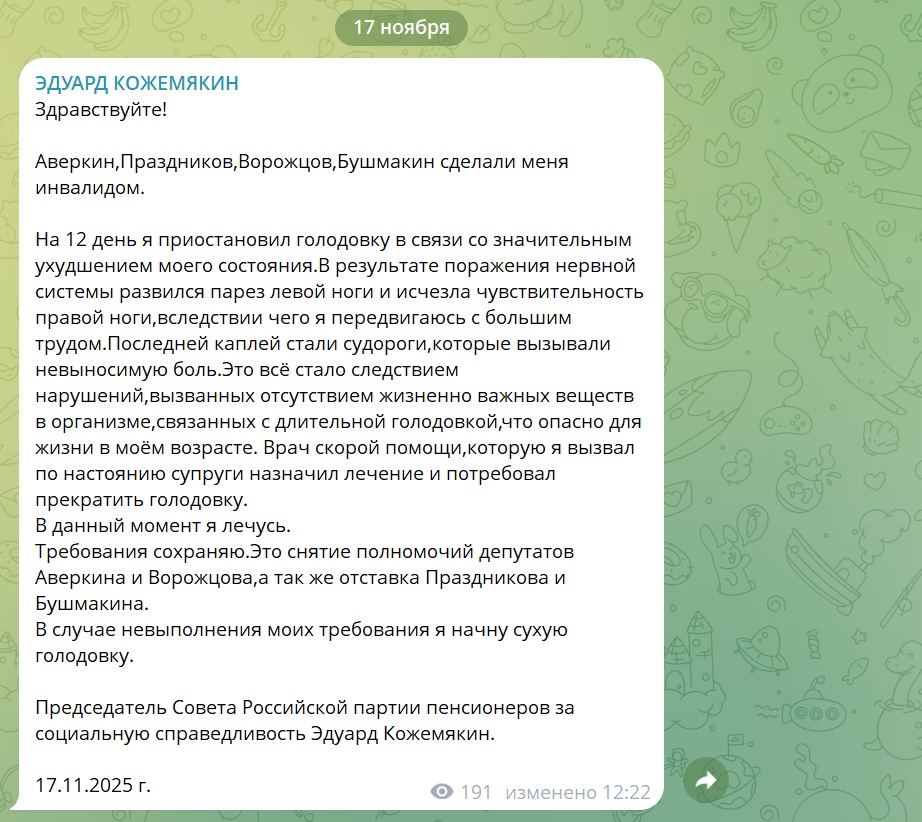 Вечером 17 ноября 2025 года Эдуард Кожемякин сообщил о приостановке своей акции протеста, начатой 5 ноября. Причиной стало резкое ухудшение здоровья: у него развился парез левой ноги, пропала чувствительность правой конечности и начались сильные судороги. Врачи скорой помощи потребовали прекратить голодовку из-за угрозы необратимых последствий. Итог: минус семь килограммов веса и ни шагу назад в политических требованиях.
