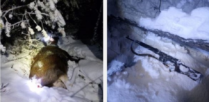 Вскоре в лесу раздалось несколько выстрелов. Возвращаясь к автомобилю, охотник увидел людей и попытался спрятать охотничий карабин в снегу. Пройдя по его следам, проверяющие нашли двух убитых самцов лося.