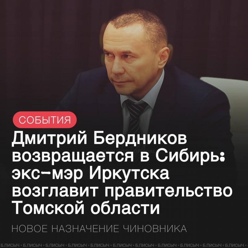 Экс-мэра Иркутска Дмитрия Бердникова, возможно, назначат председателем правительства Томской области.
