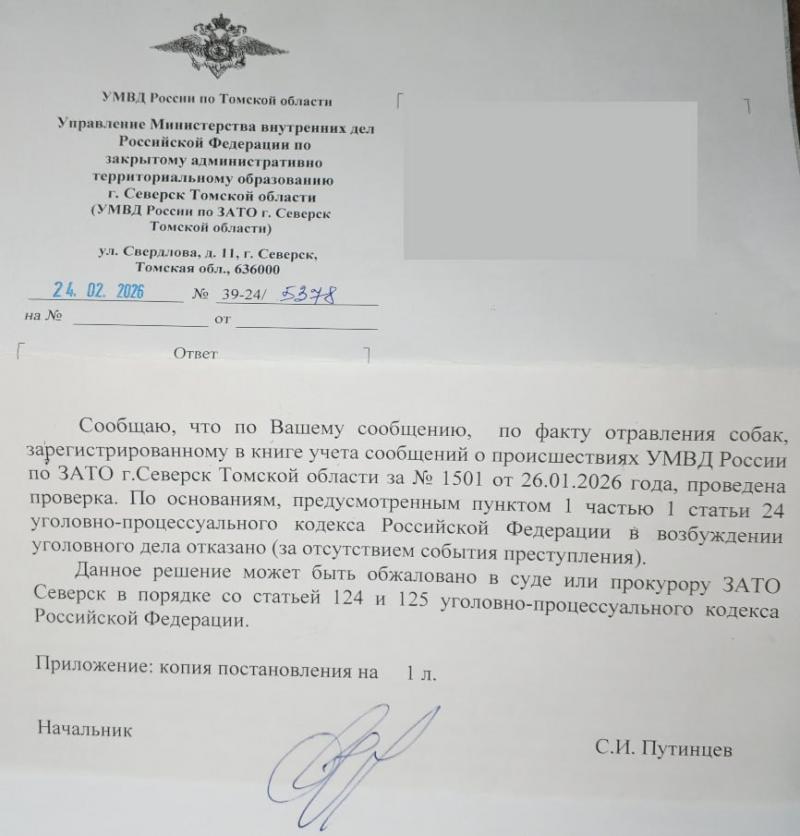 Томский активист Антон Исаков в своём тг-канале опубликовал пост о том, что два случая отравления бездомных собак оказались без признаков преступления. К посту он прикрепил документы, подтверждающие его слова. УМВД России по ЗАТО Северск отказало в возбуждении уголовного дела после проведения проверок по заявлению, поступившему в январе 2026 года. По словам следователей, отсутствует событие преступления. Отдел полиции по Октябрьскому району Томска вынес точно такое же решение.
