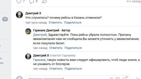 Отметим, когда в начале октября из расписания пропали рейсы в Казань, люди пошли с вопросами в соцсети к директору аэропорта Дмитрию Гармаеву.