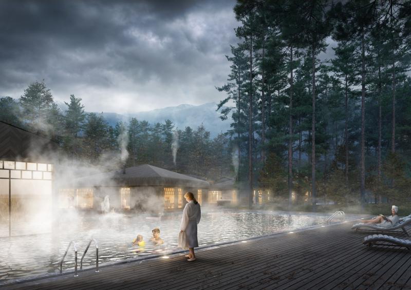 Рендер проекта туристического комплекса от MAD FOX architects с видом на акватермальный комплекс