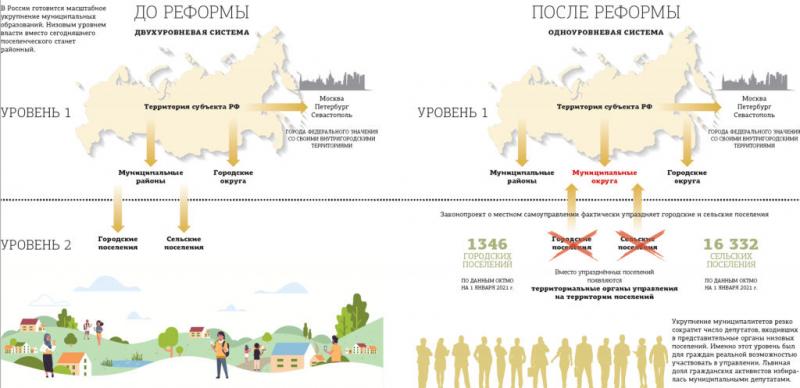 После реформы сельские и городские поселения упразднят. На их месте появятся «территориальные органы местной администрации». Бывшая администрация села станет просто кабинетом, где будет сидеть сотрудник, подчиняющийся напрямую главе округа из райцентра. У него не будет ни своего бюджета, ни полномочий для принятия самостоятельных решений.