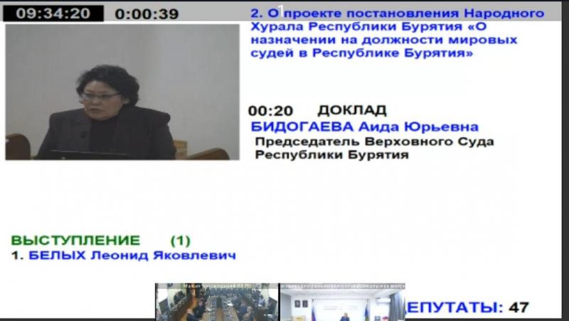 09:48 Начали назначать мировых судей. На трибуне председатель Верховного суда Аида Бидогаева во всём черном. Четырёх судей из Заиграевского, Муйского, Бичурского и Закаменского районов переназначают на должности, теперь уже бессрочно. Вопросов у депутатов нет.
