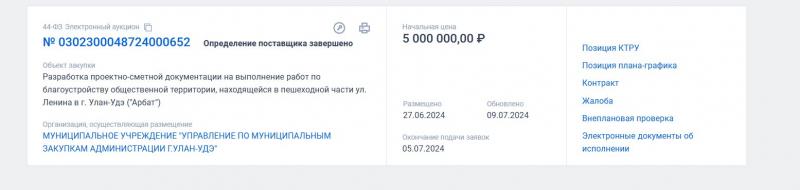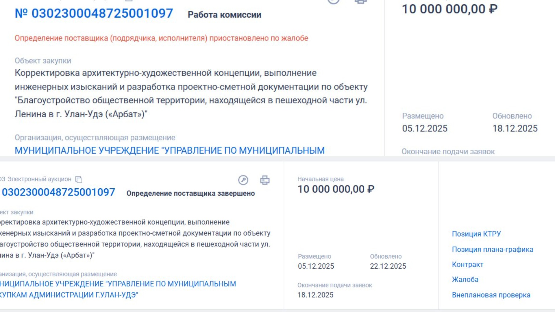 Отметим, что у города уже был действующий контракт на новое проектирование Арбата. В 2024 году тендер на разработку выиграло ООО «СпецПро» (город Владимир, ОГРН 1083328005760). Цена составила 4,4 миллиона рублей при начальной цене контракта в пять миллионов рублей . Однако КГХ мэрии Улан-Удэ изначально не выдал фирме градостроительный план, после заблокировал техусловия на фонтан и через несколько месяцев расторг договор в одностороннем порядке. Об этом сообщает телеграм-канал «Удинский мост».