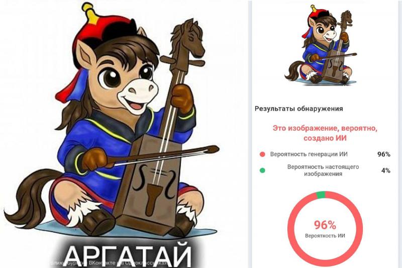 Победителем жюри признало работу Анастасии Бамбалаевой из Заиграевского района – коня по имени Аргатай, «дружелюбного, живого и многогранного героя», как его описало ведомство. Девушке достался главный приз – 50 тысяч рублей. Почти сразу после публикации итогов пользователи обратили внимание на визуальные особенности изображения и предположили, что рисунок мог быть сгенерирован нейросетью. Проверки через открытые сервисы показали высокую вероятность использования ИИ – 96 %. Не допустимо, скажете вы. Однако туз оказался в кармане министерства.