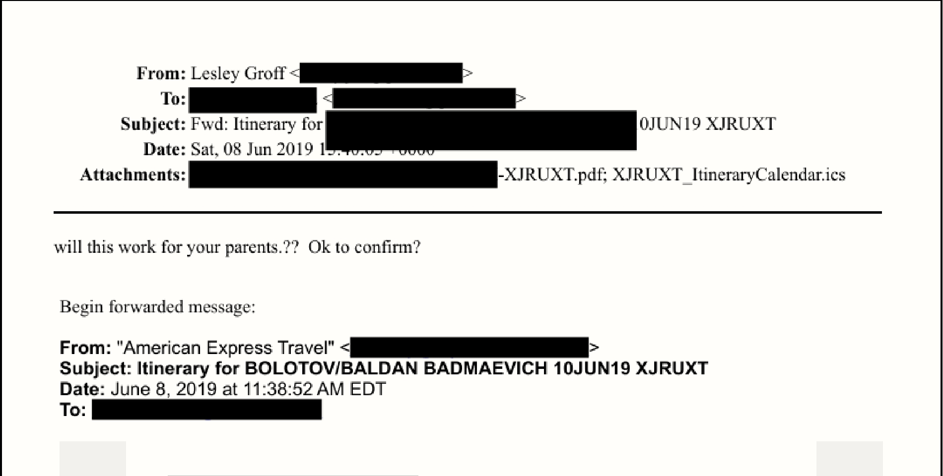 В массиве документов вскрылась переписка Лесли Грофф, правой руки и личной ассистентки Эпштейна. Речь шла о срочной покупке авиабилетов для пассажира по имени Балдан Болотов. В письме от 1 августа 2015 года Грофф указывает на источник денег: «На карту JE Visa... эта авиакомпания не принимает Amex».