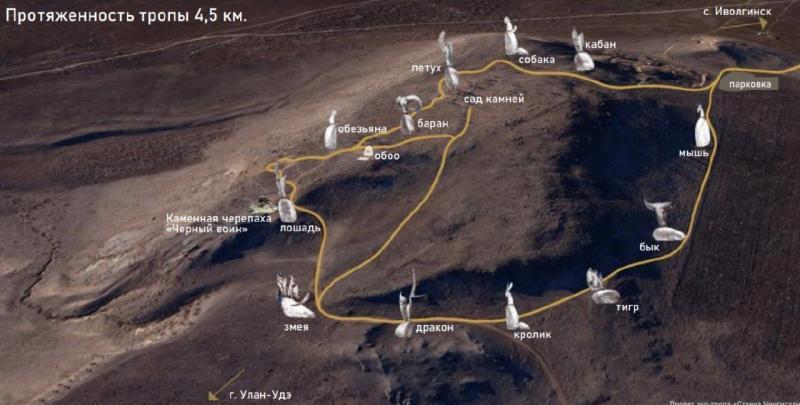На маршруте появятся смотровые площадки, беседки, информационные стенды, камеры видеонаблюдения и ночное освещение. Художественным оформлением объекта занимается Даши Намдаков. По плану скульптор установит 12 фигур животных из восточного календаря и девятиметрового Чингисхана.