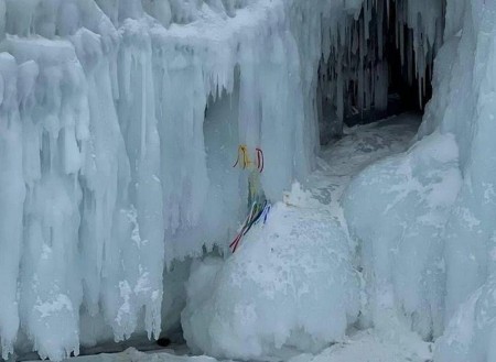На ольхонских ледяных наплесках стали появляться разноцветные ленточки. Об этом сообщает ИА «ИрСити» со ссылкой на байкальских гидов. Фото ленточек опубликовал в соцсетях Клуб байкальских гидов. Ленты стали появляться на ольхонских сокуях – ледяных наплесках – в районе Кобыльей Головы и на Хобое.