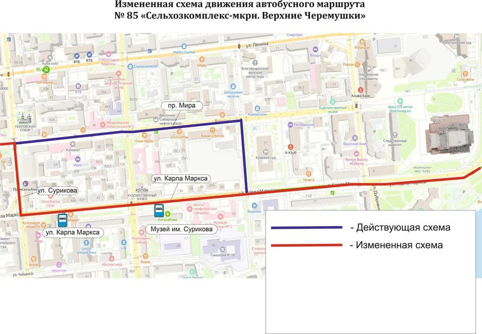 С 9 октября в историческом центре Красноярска временно изменили маршрут автобуса №85. Как сообщили в департаменте транспорта города, это связано с частичным перекрытием улицы 9 января из-за ремонта проезжей части.