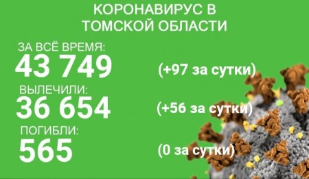 В Томской области по состоянию на 1 октября коронавирус зарегистрирован у 43 749 жителей региона. У 97 человек заболевание выявили в минувшие сутки. 56 пациентов выздоровели за сутки с 30 сентября по 1 октября. Всего с начала эпидемии излечились 36 654 человека.