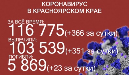 По данным на 2 октября, в Красноярском крае 116 775 случаев заражения коронавирусом. За последние сутки выявили 366 новых случаев. За всё время выздоровело 103 539 человек, в том числе 351 за последние сутки. Количество погибших достигло 5869. Скончалось ещё 23 пациента с COVID-19.