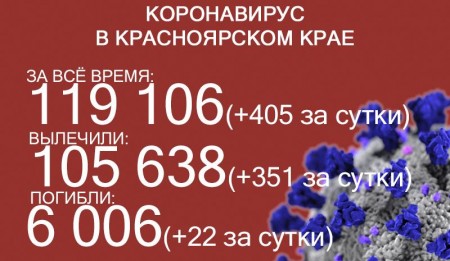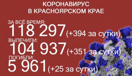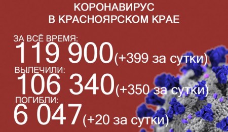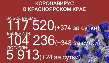 По данным на 4 октября, в Красноярском крае 117 520 случаев заражения коронавирусом. За последние сутки выявили 374 заболевших. За всё время выздоровело 104 236 человек, в том числе 348 за последние сутки. Количество погибших достигло 5913, скончалось ещё 24 заражённых COVID-19.