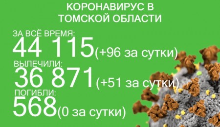 В Томской области за сутки с 9 по 10 октября коронавирус выявили ещё у 96 человек. Всего зарегистрировано 44 618 случаев заражения. За время эпидемии от коронавируса излечились 37 153 человека, 64 из них выздоровели в минувшие сутки.