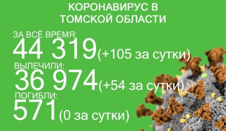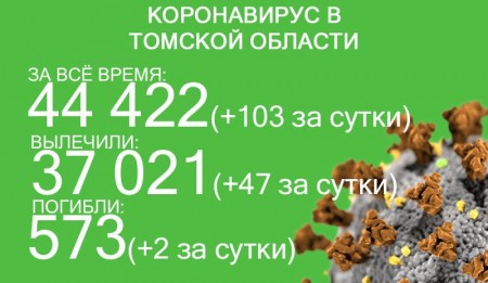 В Томской области по состоянию на 8 октября коронавирус зарегистрирован у 44 422 жителей региона. У 103 человек заболевание выявили в минувшие сутки. 47 пациентов выздоровели за сутки с 7 по 8 октября. Всего с начала эпидемии излечился 37 021 человек.